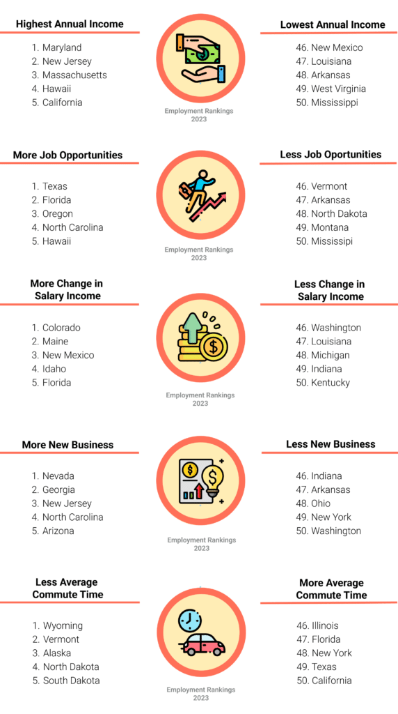 To determine which states offer the best employment opportunities in the U.S, Scholaroo data team analyzed the 50 states through 5 key categories of employment and opportunities – Job Market, Affordability, State Economy, Quality of Life, and Business Friendliness- and 43 metrics ranging from employment opportunities, labor force participation, and unemployment rate.