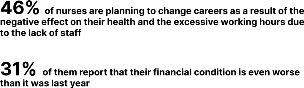 • 46% of nurses are planning to change careers as a result of the negative effect on their health and the excessive working hours due to the lack of staff;